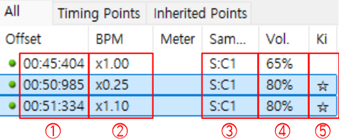 초록선은 슬라이더 속도, 히트사운드 설정, 키아이 타임 설정을 위해 사용합니다. 한 번에 여러 설정을 동시에 적용할 수 있습니다.