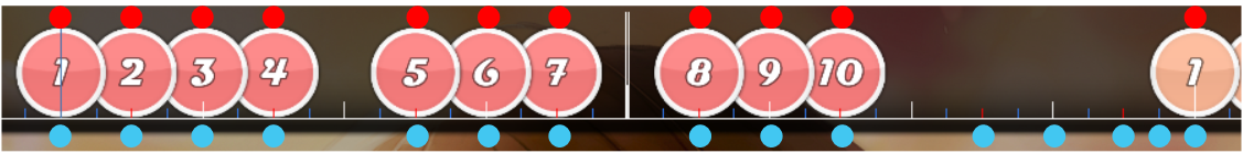 바로 이런 경우에 하위 레이어를 표현하는 것을 생각할 수 있습니다. 이 곡은 배경음이 다른 요소에 비해 약하기 때문에, 드럼을 표현하는 것을 생각해봅시다. 아래 그림은 첫 소절에서의 드림의 위치를 파란색으로, 보컬의 위치를 빨간색으로 타임라인에 나타냈습니다.