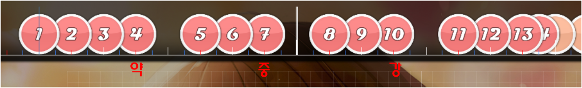 11번 서클부터 1번 서클까지 보컬이 이어지면서, 1/4 드럼이 나옵니다. 보컬의 끌림음을 표현하기 위해 슬라이더를 사용하면서 드럼을 표현할 수 있는 박자는 아래와 같습니다.
